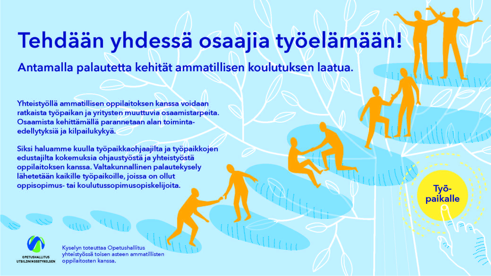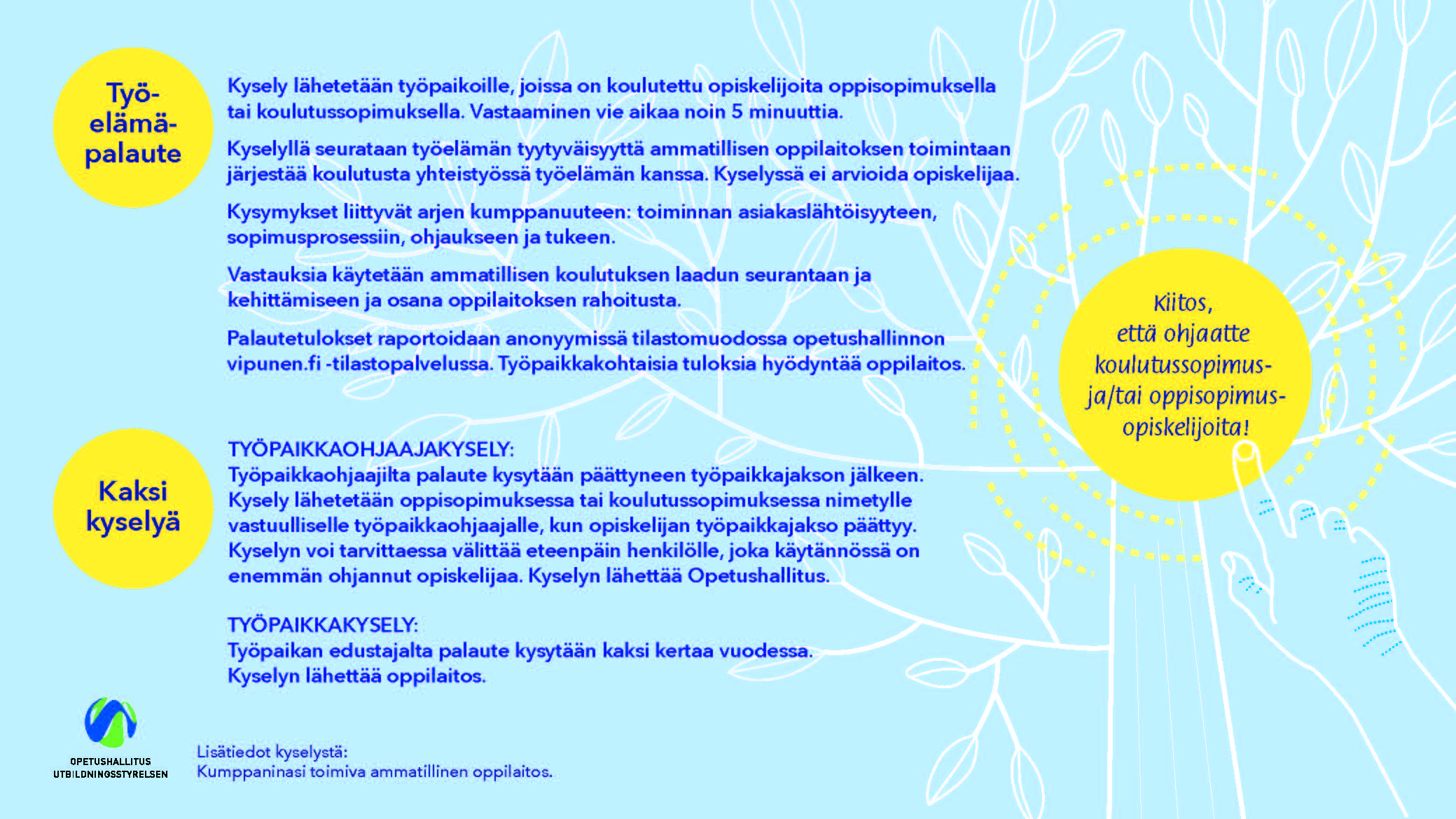 Työelämäpalautteessa on kaksi erillistä kysymystä, toinen työpaikkaohjaajille ja toinen työpaikoille. Vastaamiseen kuluu noin viisi minuuttia.